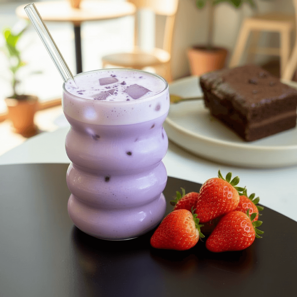 Ube latte fraise chaud, boisson violette fruitée et réconfortante.